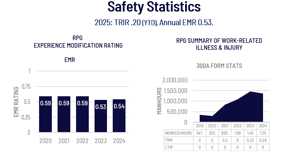 RPG has successfully embraced a zero safety incident workplace, which establishes clear and achievable standards for realizing safety goals. The result is excellent safety performance yielding one of the best safety records in the industry.